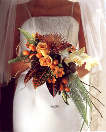 Bouquet asymétrique composé dorchidée, protéa,roses oranges, fruits et feuillages exotiques.